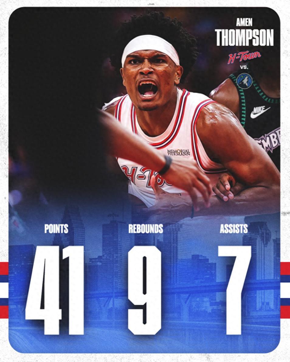 在阿門-湯普森打出生涯之夜時火箭還是輸球了,阿門42分鐘,22中17,命中率高達77.3%,全場比賽暴扣8次,拿到41分9籃板7助攻2搶斷,得分創造生涯新高,也是生涯首次40+,可在一場對攻大戰還是無法擊敗殘陣森林狼。