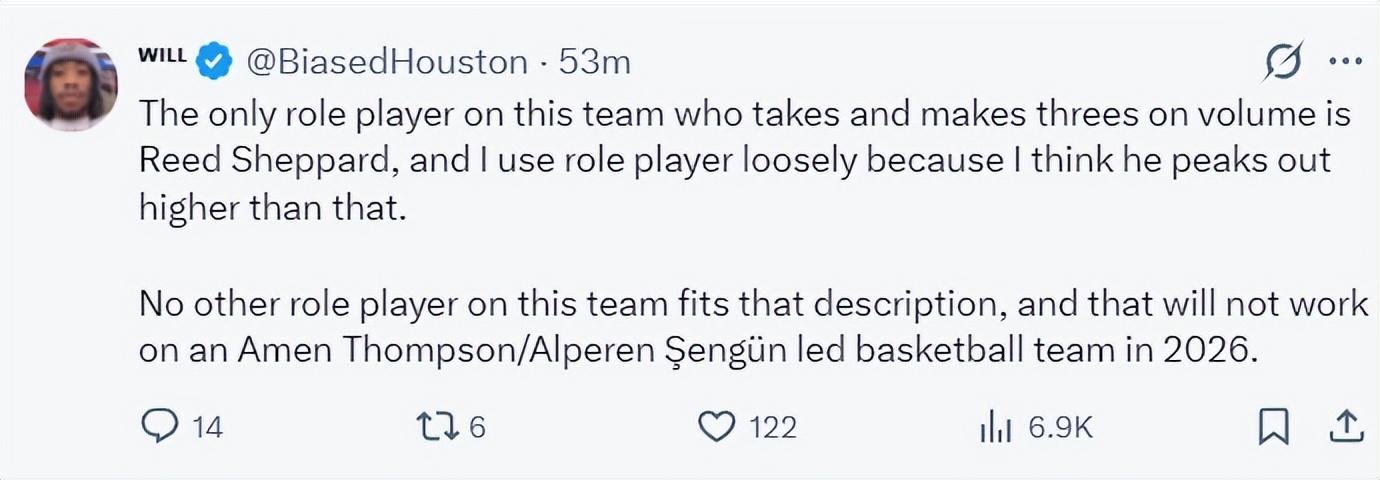 他繼續寫道:在這場比賽中,申京、杜蘭特、阿門都發揮出色,但最終火箭輸球了,原因就在於三分產量與三分命中率。很明顯休賽期我們的目標就是找到那些能穩定命中遠投又能承擔大量進攻任務的球員。