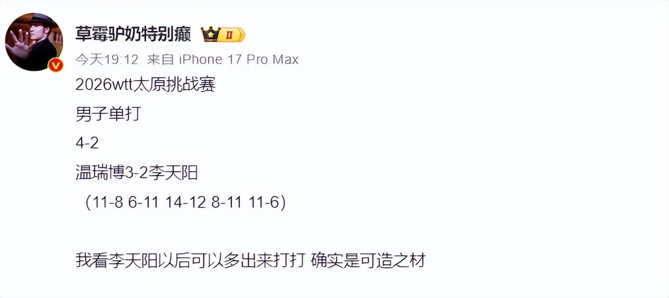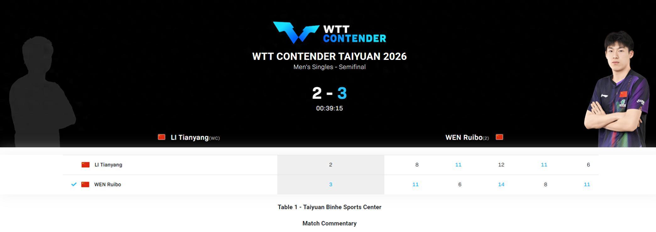 2026年WTT太原常規挑戰賽,男單半決賽,溫瑞博3-2擊敗李天陽晉級決賽,五局比分:【11-8,6-11,14-12,8-11,11-6】。這場比賽是國乒的內戰,但溫瑞博的對手李天陽是一位名不見經傳的選手,他在WTT就連圖像Logo都沒有。