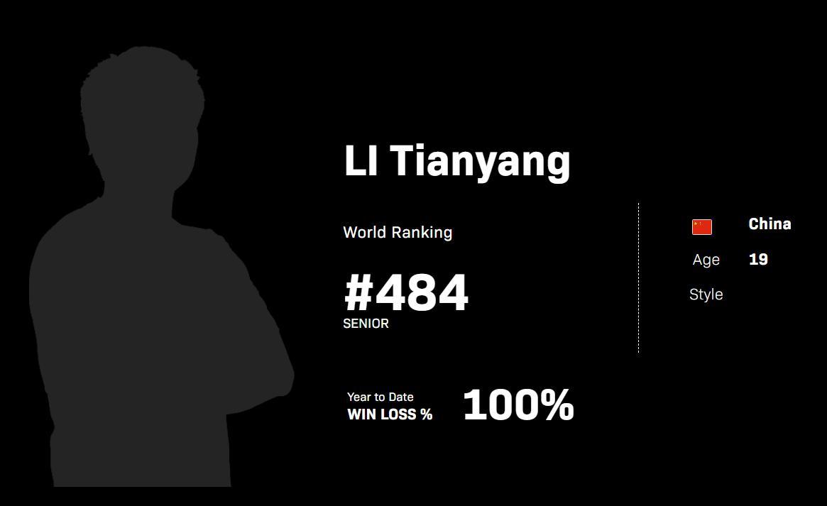 李天陽在太原常規賽險些就一黑到底了,他先後擊敗多位強手:3-2英田理志、3-0陳垣宇、3-0坂井雄飛,如果擊敗世界排名第14的溫瑞博就進入決賽了,作爲男乒的削球手能有如此表現的已經非常少見。