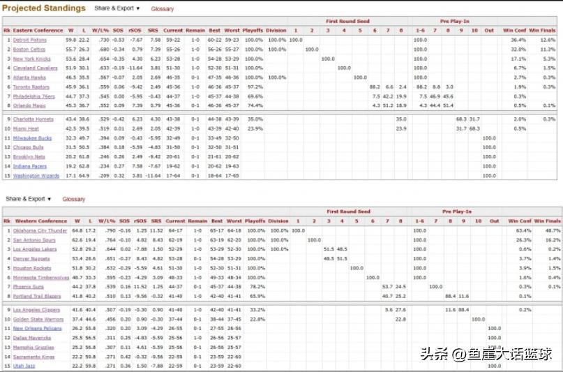 可以看到東西部前兩名都是有着極大奪冠概率,不過比起東部的活塞、凱爾特人,顯然西部這邊的雷霆、馬刺有着更大的奪冠概率,而這樣的排名也是有着事實根據。要知道雷霆在本賽季依舊是打出了很好的狀態,尤其是考慮到了雷霆在常規賽還是遭遇了不少的傷病,因此雷霆現在展現出來的實力還是很強大,不過對於雷霆來說,他們在西部的最大對手恐怕還是馬刺,畢竟在常規賽雷霆對陣馬刺的時候真的是處於下風,如果兩隊在季後賽相遇的話,雷霆想要擊敗馬刺還是有着巨大的難度。