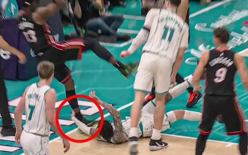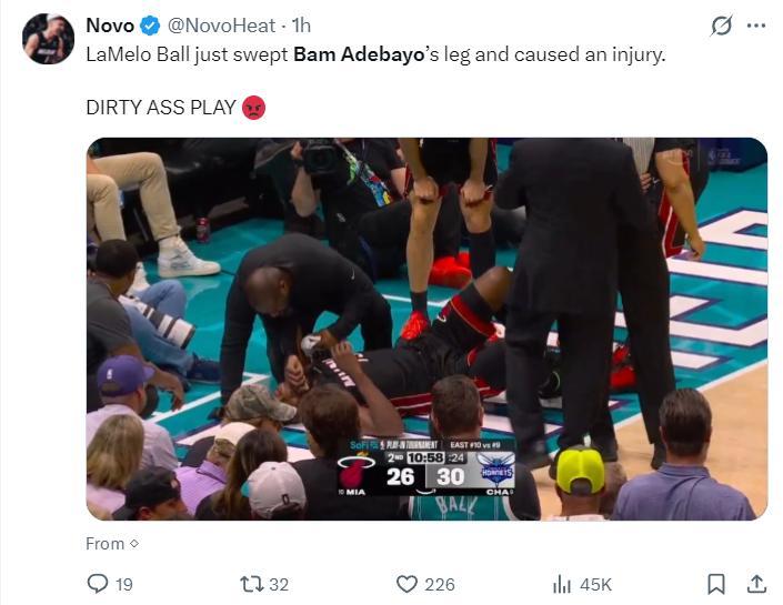 這場比賽非常激烈,在第二節就發生了極其令人憤怒的一幕,拉梅洛-鮑爾在自己對抗倒地後拉拽了阿德巴約的腳後跟,讓阿德巴約失去平衡,腰背部直接着地,熱巴痛的在地上呻吟。