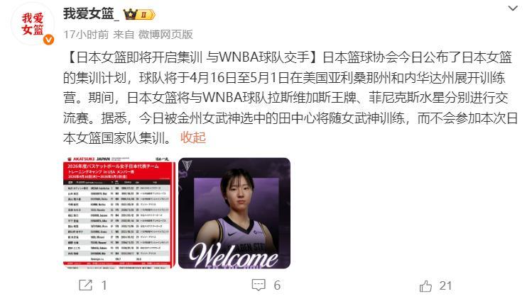 根據我愛女籃的報道,日本女籃即將開啓集訓,她們將於4月16日-5月1日在美國展開訓練營,日本隊將於拉斯維加斯王牌、菲尼克斯水星進行交流賽,日本王牌田中心剛剛被金州女武神選中,她去到美國後會跟隨女武神訓練不會參與日本女籃國家隊的集訓。(不得不說日本女籃與ENEOS向日葵隊都在努力託舉田中心登陸WNBA)