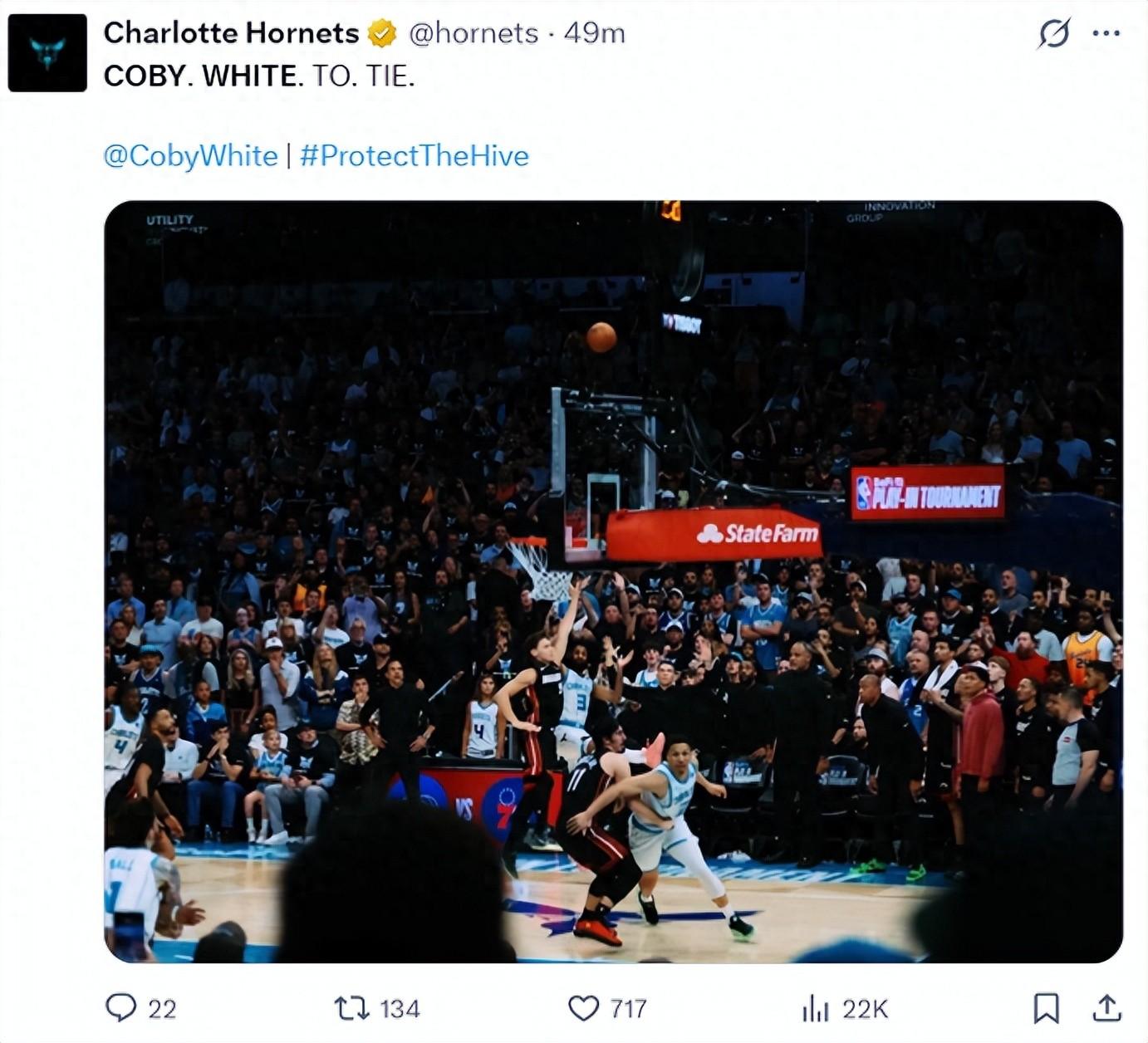 科比-懷特是黃蜂交易截止日才換來的新援,他這是黃蜂生涯的第第26場比賽,附加賽下半區的球隊是單敗淘汰賽,懷特這個三分球的含金量非常之高。
