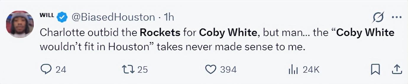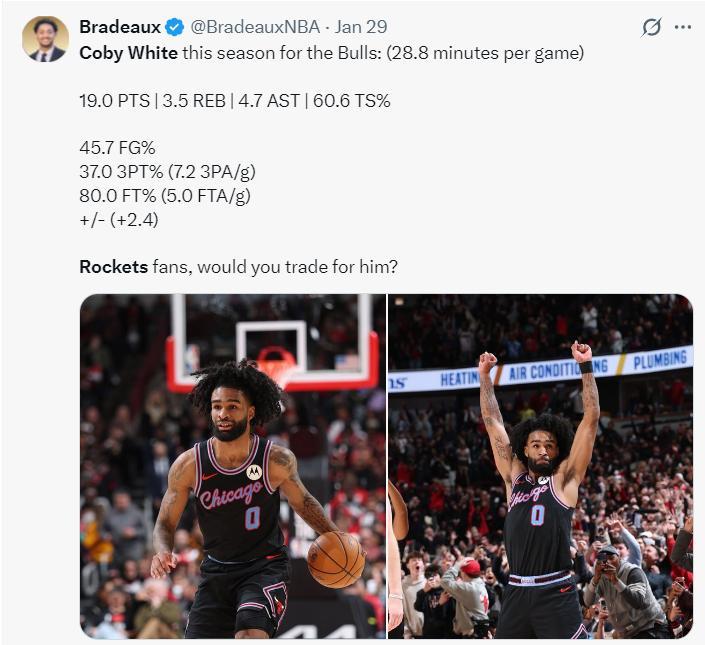 在懷特被擺上貨架後,火箭記者Bradeaux就寫道,懷特在公牛場均28.8分鐘可以拿到19分4.7助攻3.5籃板,三分命中率37%,真實命中率60.6%,火箭球迷們喜歡他來嗎?