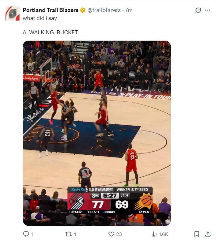 在第三節末尾太陽打出一波13-4的小高潮直接將分差縮小到1分,阿夫迪亞三節打完已經拿到27分9助攻4籃板2蓋帽,開拓者的氣勢一下就沒了。