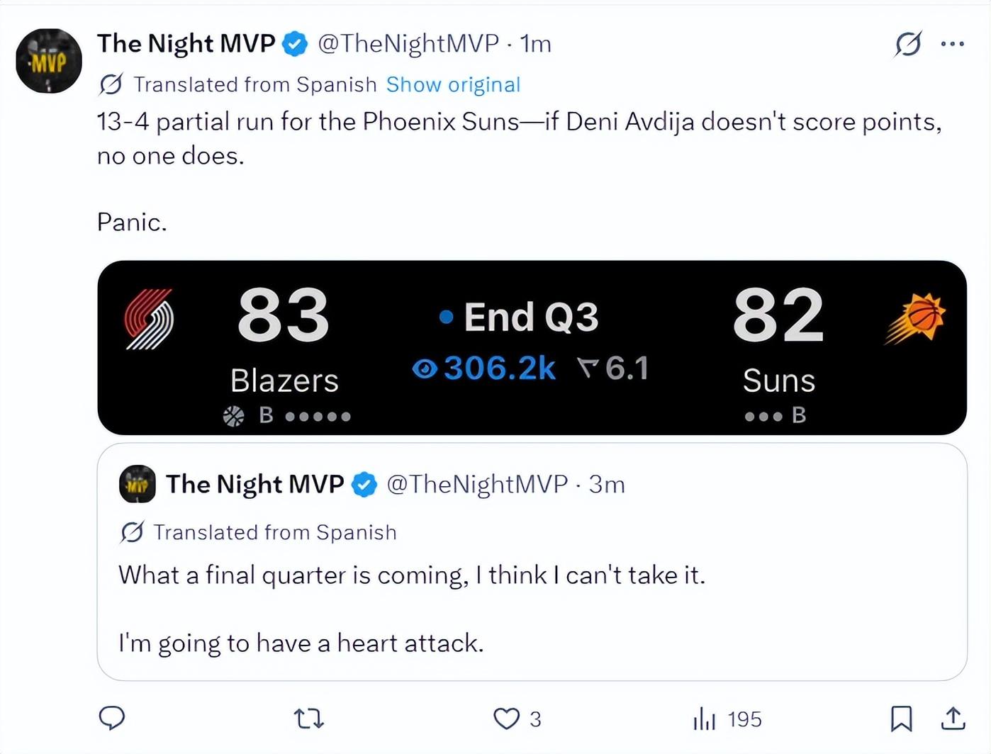 第三節還剩5分鐘27秒阿夫迪亞的上籃命中後開拓者已經領先太陽10分,阿夫迪亞單節已經拿到11分2籃板2助攻,都覺得開拓者要打崩主隊太陽了,但沒想到布克帶着4次犯規幫助鳳凰城頂住了。