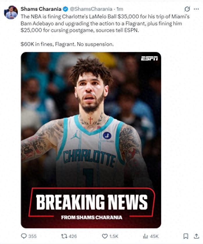 北京時間4月16日,根據ESPN名記Shams的報道,拉梅洛-鮑爾惡意絆倒阿德巴約被罰款6萬,該動作被升級爲二級惡意犯規但不禁賽。