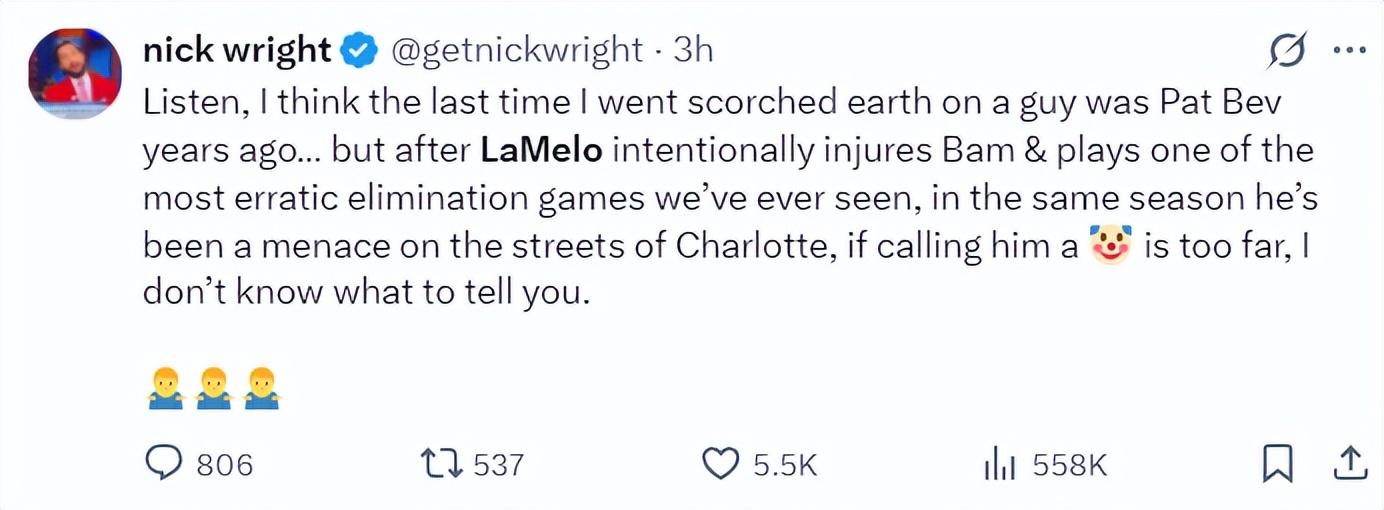名嘴尼克-賴特在回應了鮑爾的言論,拉梅洛的那個動作讓我想起了多年前貝弗利那次無意義衝擊Russ的衝擊。我更無法理解的是拉梅洛在贏得混亂的系列賽後在夏洛特的街頭極盡猖狂,我覺得將他稱之爲“蠢貨”也不過分了。
