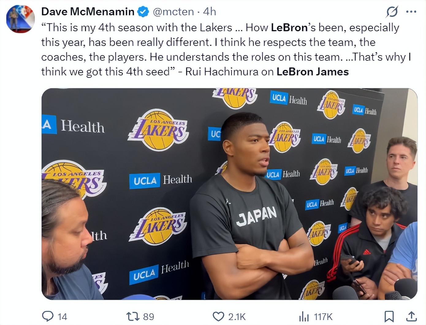 八村壘談到詹姆斯:這已經是我來到湖人的第四年,現在看到勒布朗的狀態真的很不一樣,我覺得他非常尊重球隊、教練、隊友,他也清楚自己在這支球隊扮演的角色,這也是我們能排在西部上半區的關鍵。