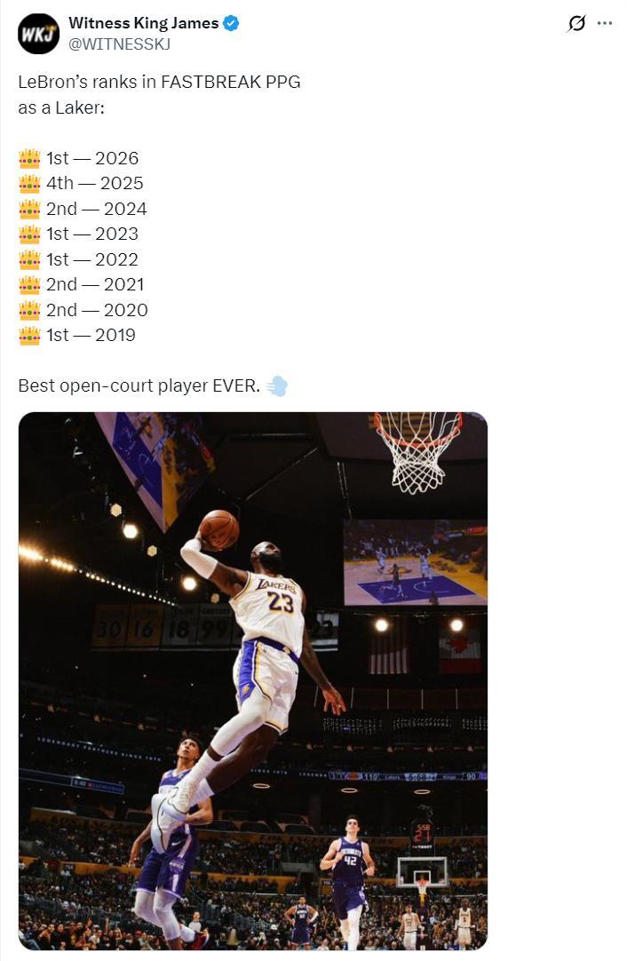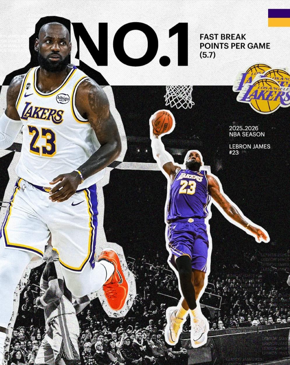 湖人官方在這一天還曬出了勒布朗本賽季場均快攻5.7分聯盟第一,今年12月就要年滿42歲的老將在這項數據上還能獨佔鰲頭足以證明他仍在巔峯。