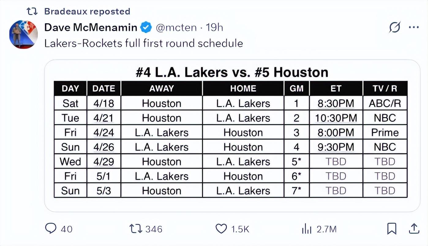 火箭VS湖人的賽程已經全部出爐,4月18日開啓第一場,4月21日第二場,4月24日第三場,第四場4月26日,第五場4月29日,第六場5月1日,第七場5月3日。