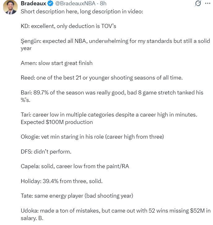 最終的評分,杜蘭特A、申京B+、阿門A-、謝潑德A、小賈B、伊森C-、奧科吉A+、芬尼F--、卡佩拉B-、霍勒迪B+、泰特B-、烏度卡B。(雖然沒有範弗利特、亞當斯陣容還是很強)