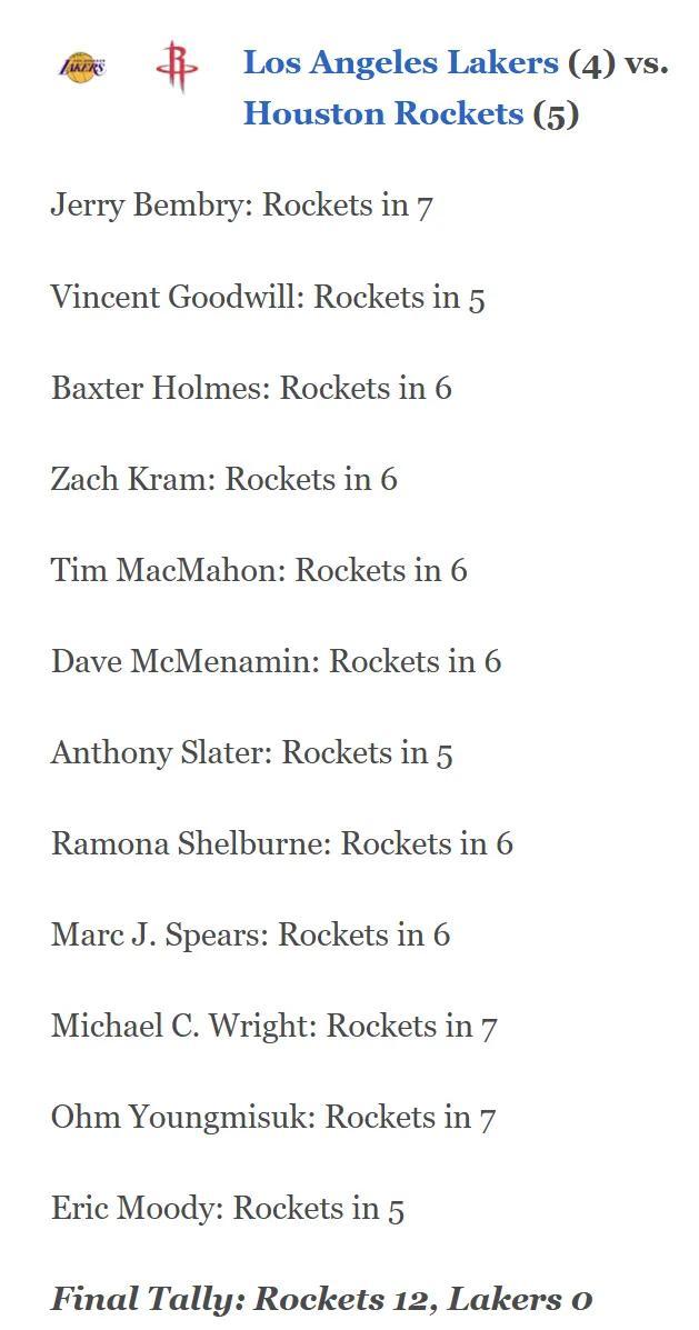 在4月14日季後賽對陣出爐時,就有數據媒體預測火箭淘汰湖人的概率超過80%,而在ESPN12位專家的預測中全都看好火箭晉級:三人看好4-1,六人看好4-2,三人看好4-3。