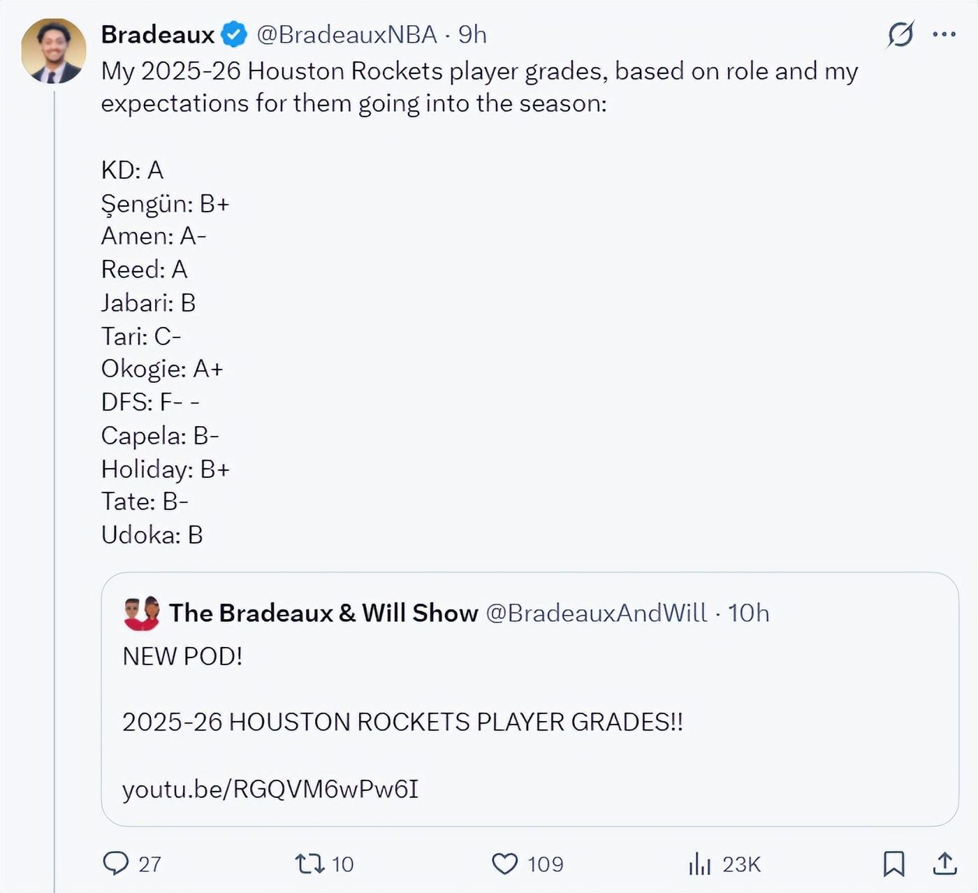 休媒Bradeaux對本賽季火箭隊的球員進行評級: