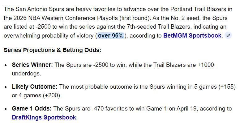 根據美媒BetMGM的預測,西部第二(62勝20負)馬刺淘汰西部第七(42勝40負)開拓者的概率高達96%。馬刺4-0橫掃開拓者+200,馬刺4-1開拓者+155,很明顯開拓者被看衰的非常厲害。