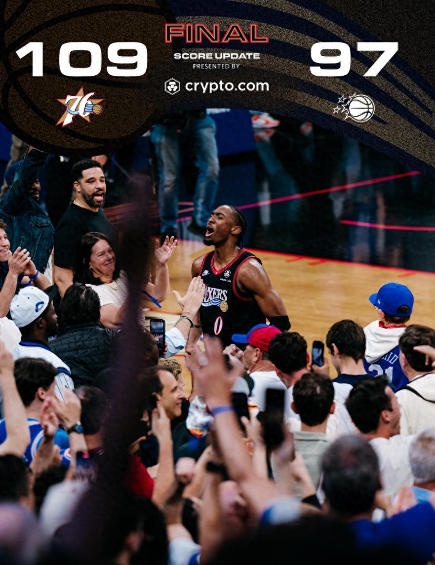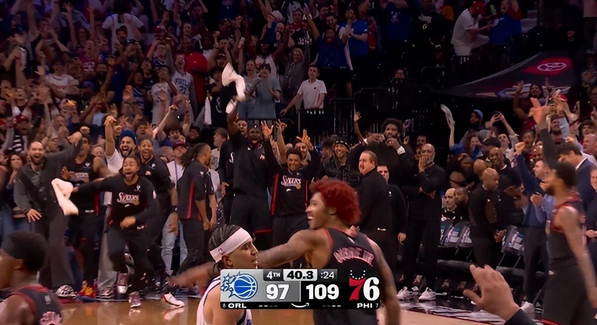 這一球命中後費城球館都沸騰了,替補席的球員們都起身爲莊神歡呼,烏度卡、埃奇庫姆、馬克西都已經開始慶祝了,因爲他們知道這一球后費城已經鎖定晉級了。