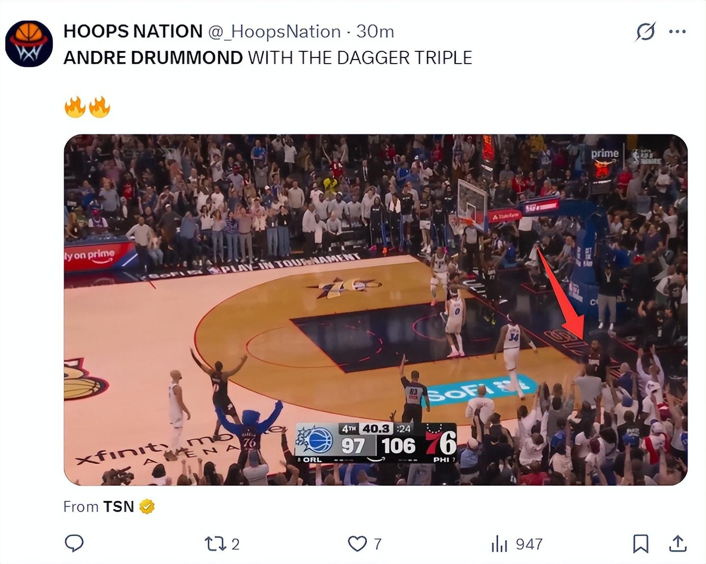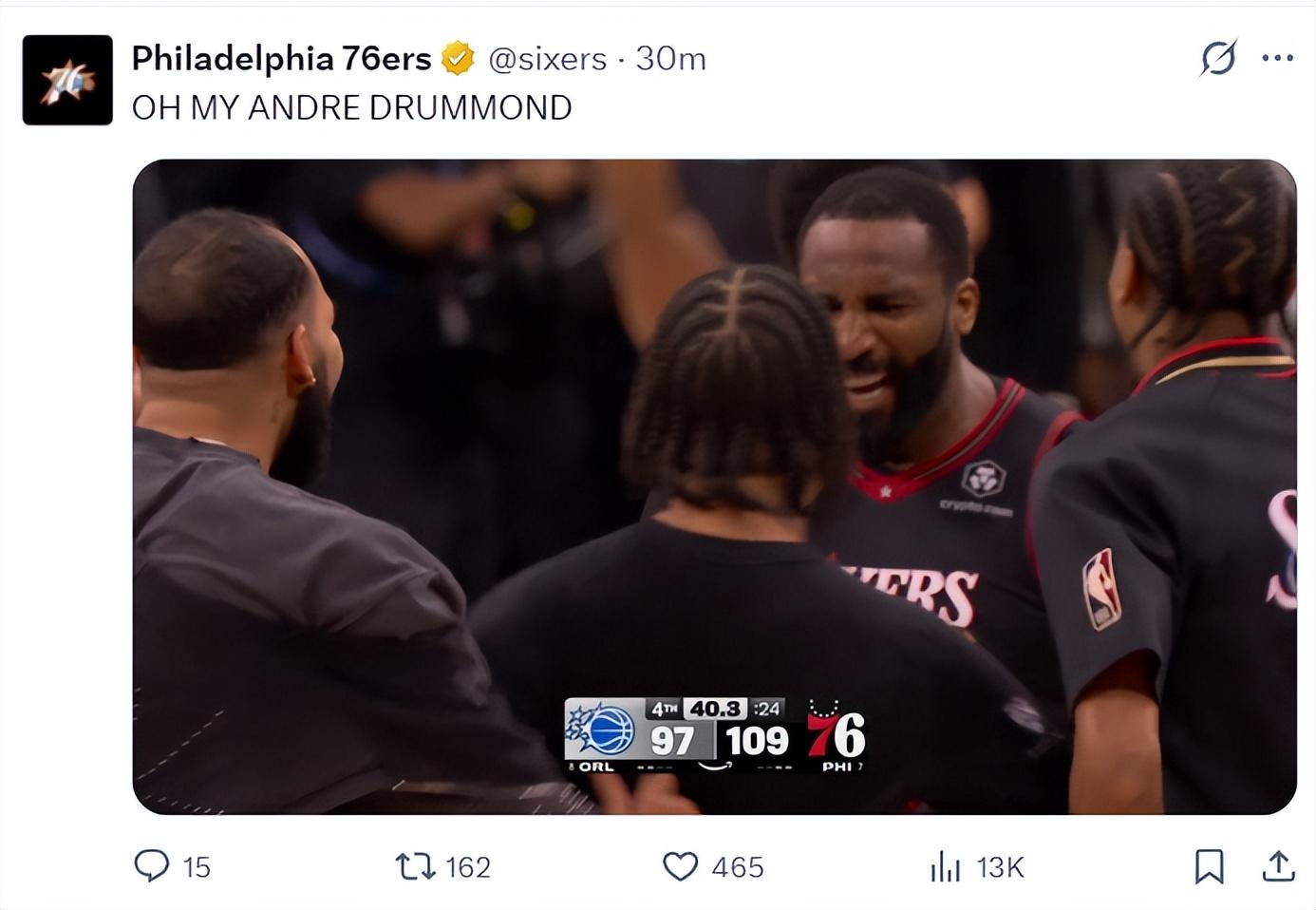 終場前40.3秒德拉蒙德在底角命中了一個鎖定勝局的三分球,這一球后費城已經領先到12分,這一球后魔術全隊都泄氣了,薩格斯直接一臉的沮喪。