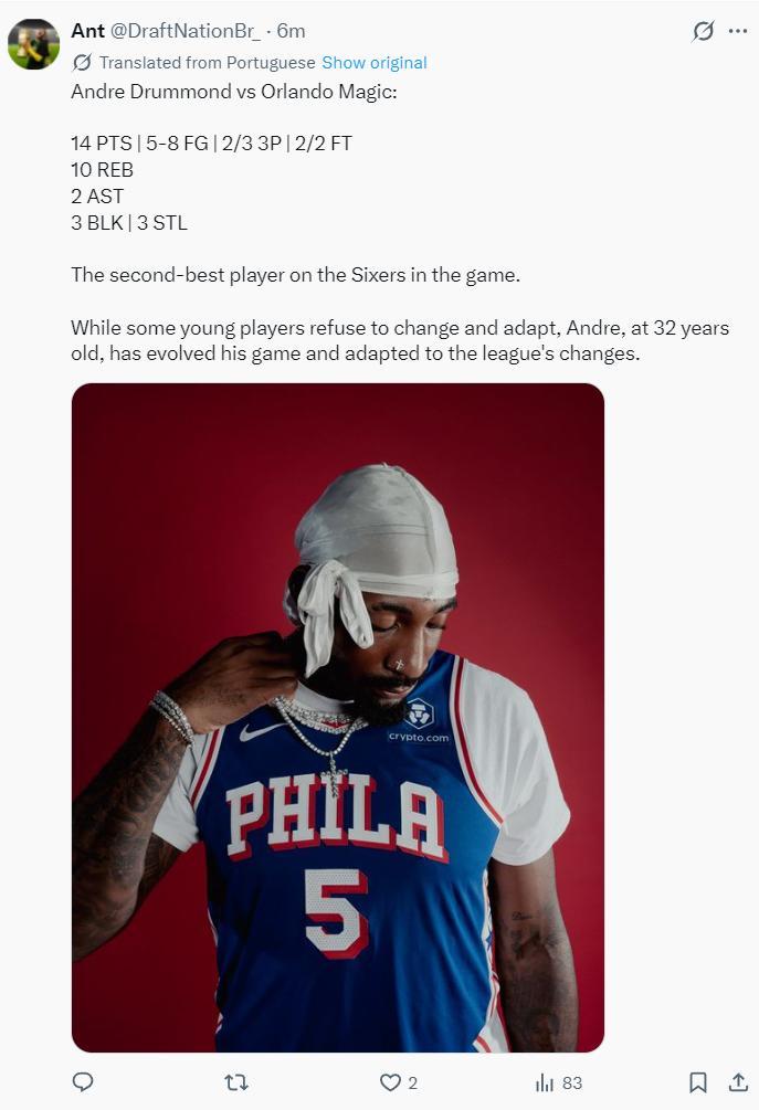 費城媒體寫道:在關鍵的一場比賽中,德拉蒙德是76人發揮第二齣色的球員,儘管一些年輕球員不願意做出改變與適應,但32歲的莊神已經改變了自己的打法,他已經具備空間型的特色適應了小球聯盟。