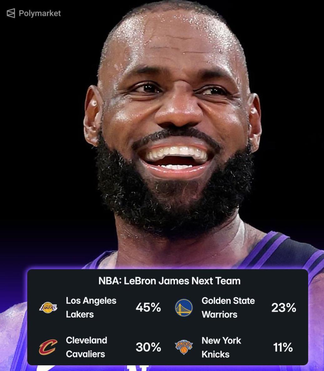 根據數據媒體的預測,勒布朗留守湖人概率45%,加盟勇士概率23%,加盟騎士概率30%,加盟尼克斯概率11%。