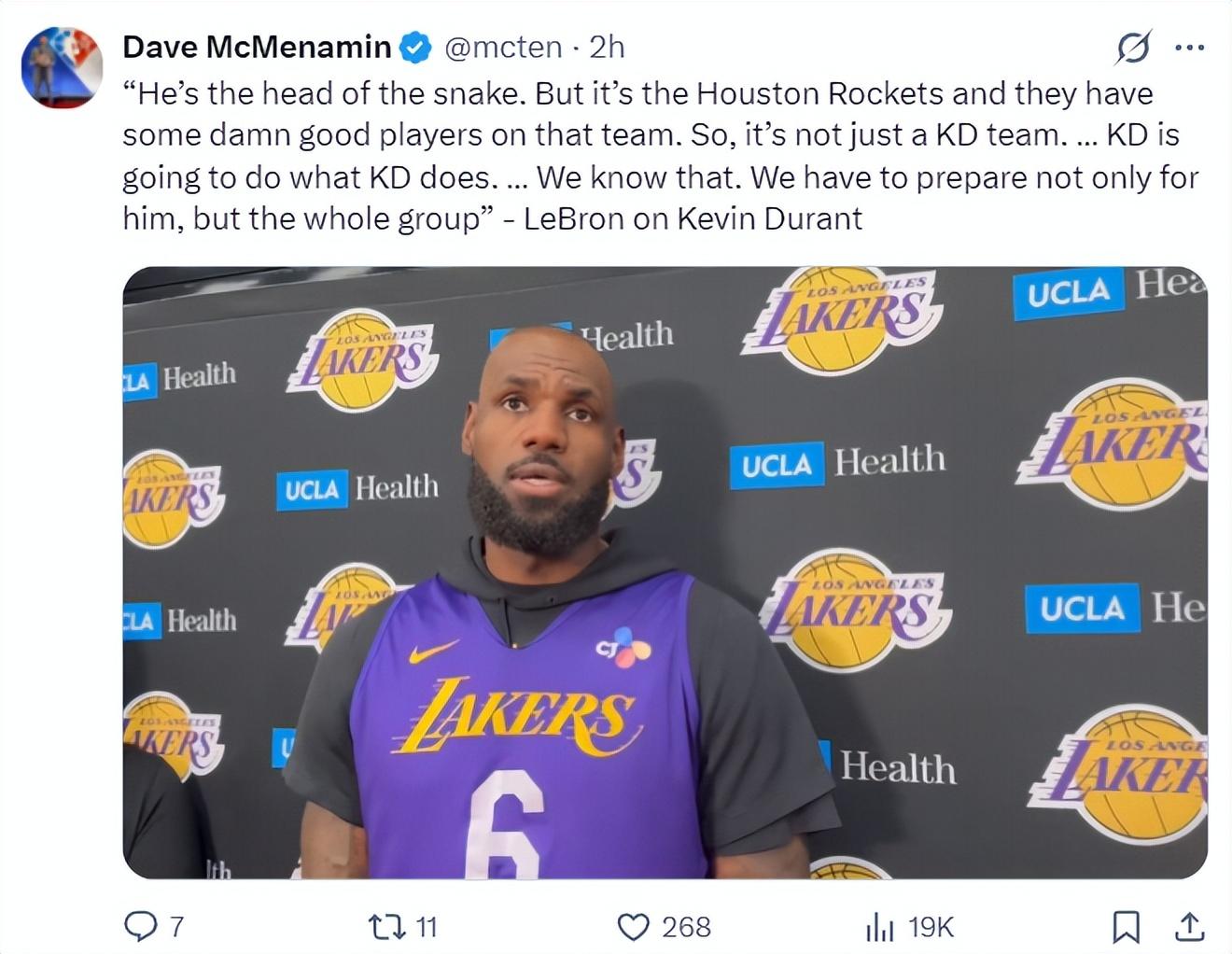 勒布朗還盛讚了37歲的杜蘭特,他表示:KD是火箭的核心,但火箭隊還有很多出色的球員,所以現在的火箭不是杜蘭特去領導,KD會按照他一貫的方式去打球,我們都很清楚這一點,我們必須爲這場比賽做好周詳的準備。