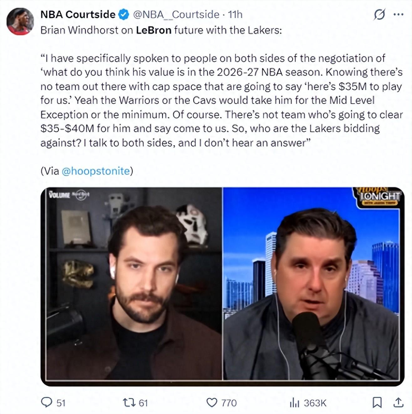 北京時間4月17日,ESPN記者布萊恩-文霍斯特在播客節目中談到勒布朗-詹姆斯的未來,他表示我專門跟多支球隊談論過,勒布朗在26-27賽季的價值是多少?要知道沒有哪支球隊會給他3500萬-4000萬,所以湖人的競爭對手是誰?我沒有聽到答案,勇士隊跟騎士隊大概率只願意爲勒布朗提供中產/底薪合同。