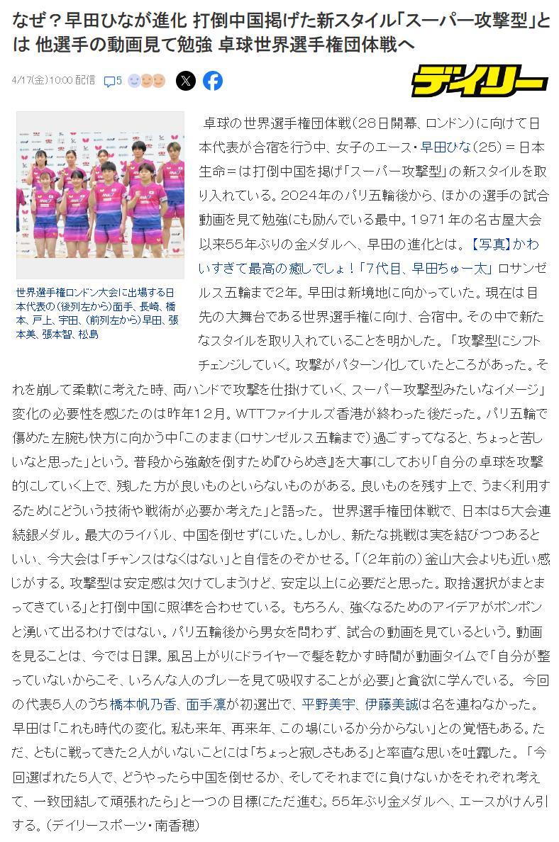 北京時間4月17日,早田希娜在接受日媒《每日體育》採訪中透露,爲了構建“超級進攻型”戰術,自己一直都在鑽研中國球員的錄像,她明白知己知彼百戰不殆的道理,中國選手依舊是全世界最強大的存在,她們的打法、戰術也是最前沿、最新的,從錄像中能學習到更多東西。(沒想到日本人也懂得師夷長技以制夷的道理)