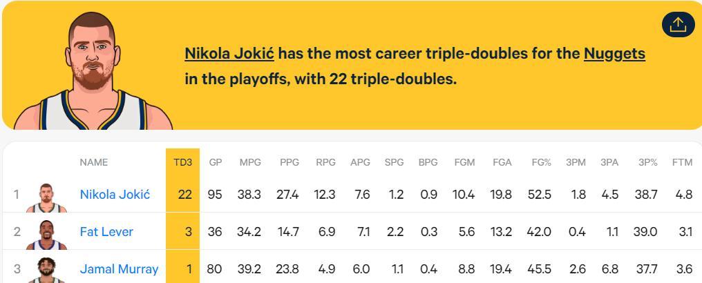 2.約基奇季後賽生涯第22次三雙,繼續刷新隊史第一紀錄;