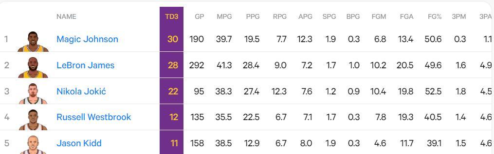 3.約基奇生涯22次三雙排聯盟第三,距離第二的詹姆斯只差6次,距離第一的魔術師只差8次;
