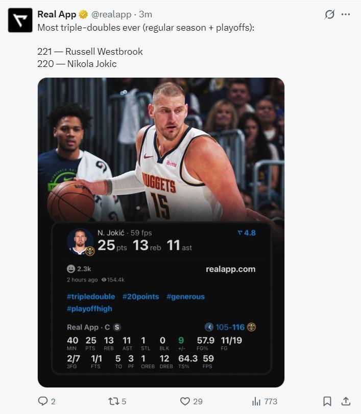 4.約基奇常規賽+季後賽三雙合計已經達到220大關,距離威少只差1次;