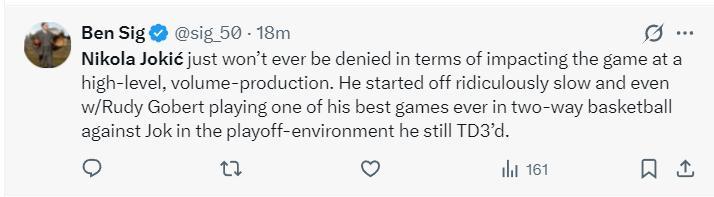 掘金記者Ben Sig寫道:約基奇在高水平的季後賽中影響比賽方面依舊無人能擋,他在開局非常慢熱的情況下也碾碎的了給戈貝爾,說實話戈貝爾已經打出他生涯最好的攻防表現,可約基奇還是拿到了三雙。