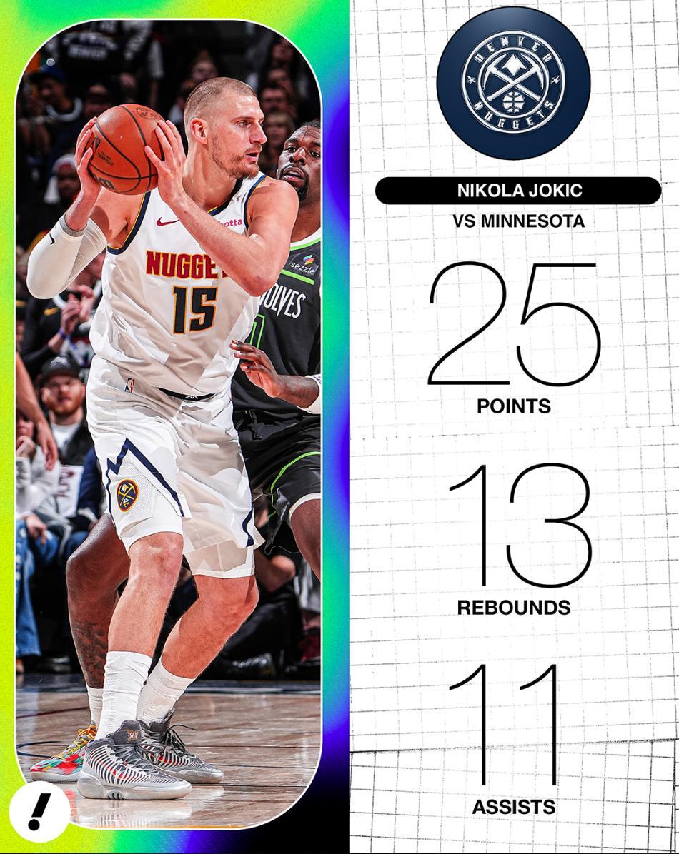 全場比賽約基奇40分鐘,19中11,三分7中2,罰球1中1,拿到25分13籃板11助攻1搶斷,命中率57.9%,正負值+9。