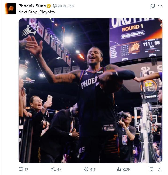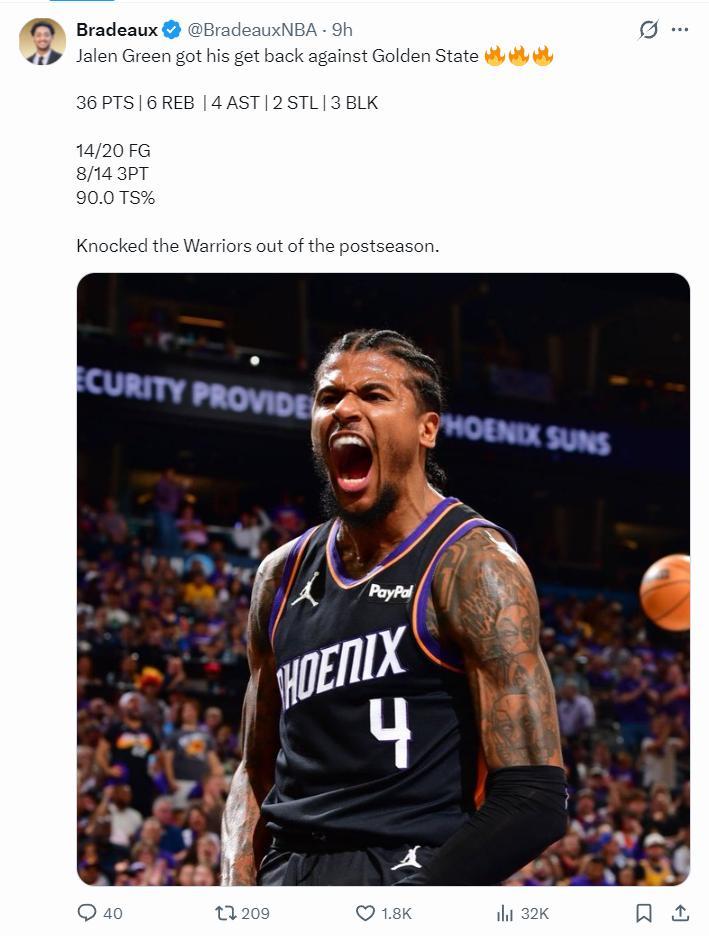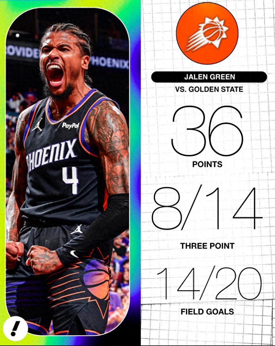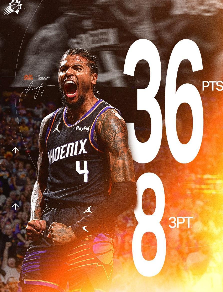 賽後杰倫-格林在主場受到了鳳凰城球迷的歡呼/吶喊,他附加賽G1拿到35分2個三分球,附加賽兩場比賽格林合計拿到71分+10個三分球,場均35.5分5.5板1.0斷2.0帽,命中率57%,三分球命中率47%。