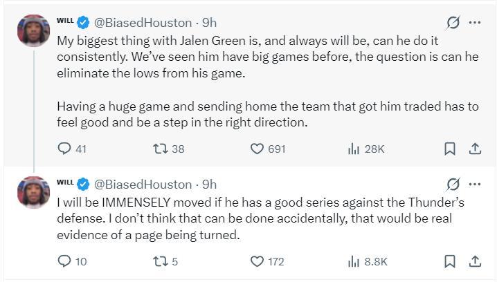 杰倫-格林還打服了休媒與火箭記者,休媒曬出格林的數據寫道,杰倫-格林在對陣勇士的附加賽中完成了復仇。(去年季後賽首輪格林面對勇士場均13.3分,命中率37%,休賽期被火箭交易)