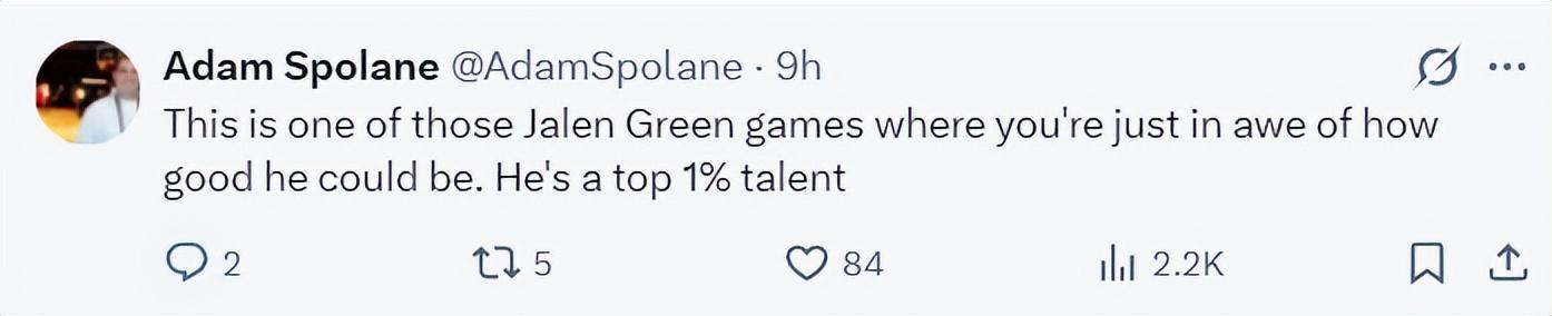 火箭記者Adam Spolane寫到:這場是杰倫-格林堪稱完美的表演,他展現出了超凡的天賦令人驚歎,他就是金字塔尖百分之一的天賦。