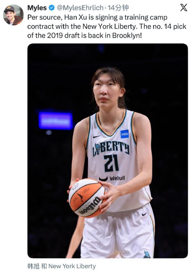 4月16日,根據WNBA記者爆料,紐約自由人跟2019年14順位的韓旭簽下了一份訓練營合同,韓旭上賽季效力WNBL入選一陣、一防、最佳防守球員,最終幫助珀斯山貓拿到亞軍的成績,韓旭的個人表現非常出色。