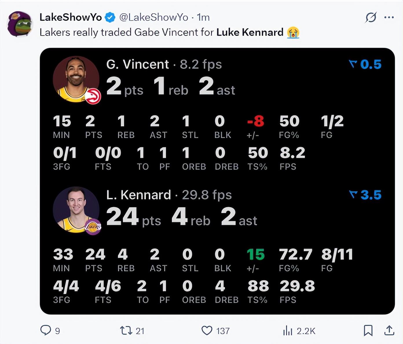 比賽還在進行中,湖人媒體曬出文森特老鷹首戰季後賽15分鐘2分2助攻,肯納德33分鐘已經拿到24分。