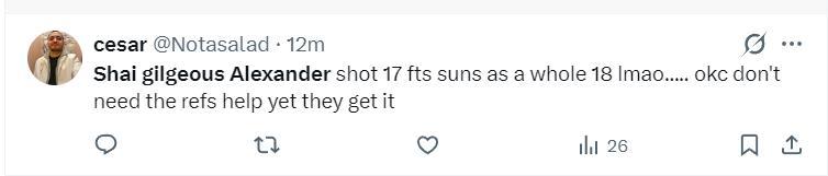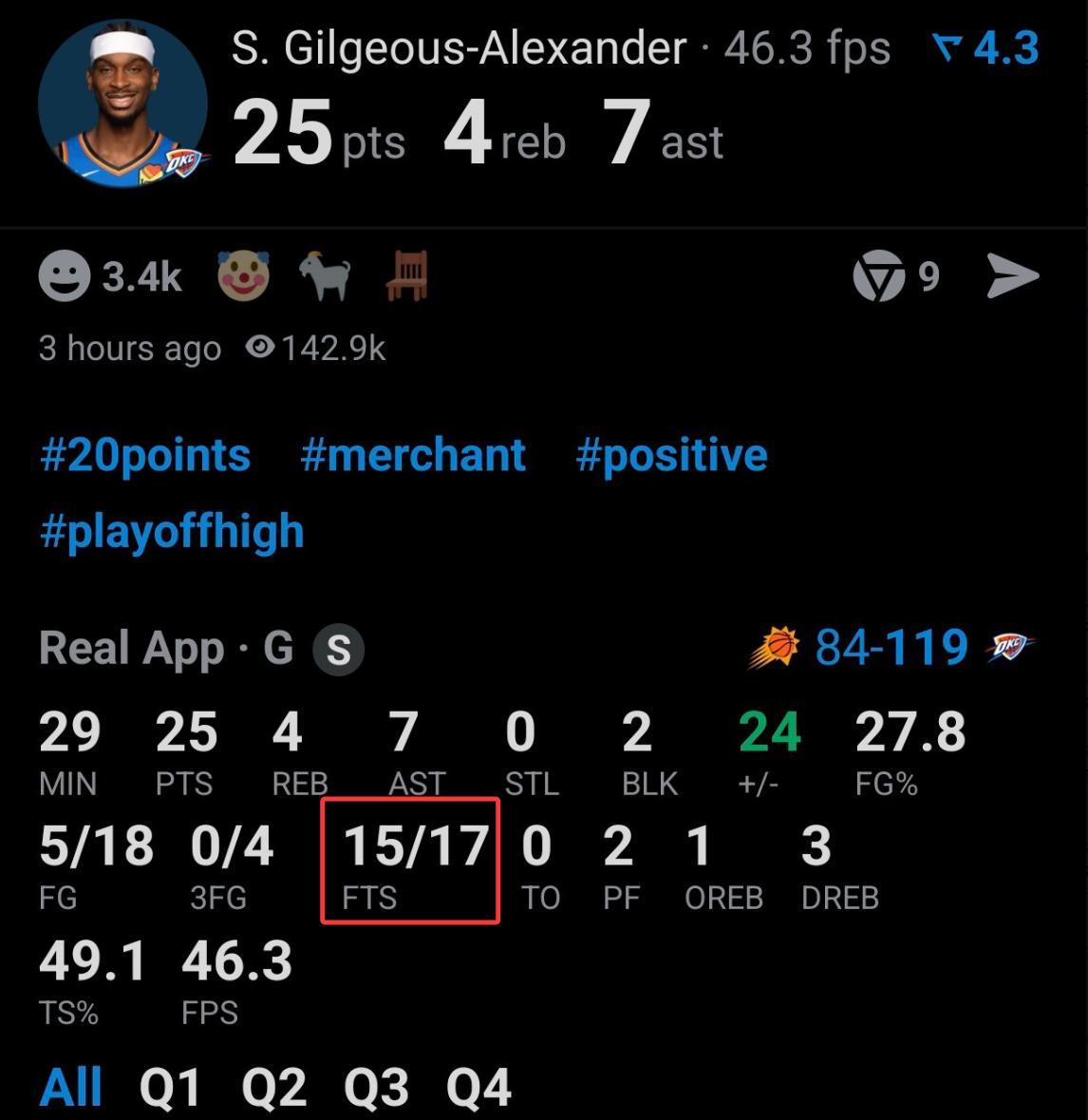 太陽全隊18個罰球,雷霆全隊23個罰球,SGA一人17個罰球,他的罰球僅差1個就跟太陽全隊一樣多。