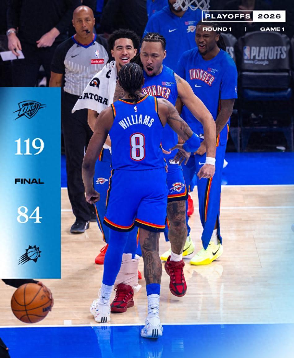 北京時間4月20日,NBA季後賽首輪G1,俄克拉荷馬雷霆以119-84狂勝菲尼克斯太陽。這是一場毫無懸念的比賽,雷霆首節就領先15分,半場拉開打21分,三節已經領先31分,末節直接進入垃圾時間。這就是聯盟第一+衛冕冠軍的統治力。
