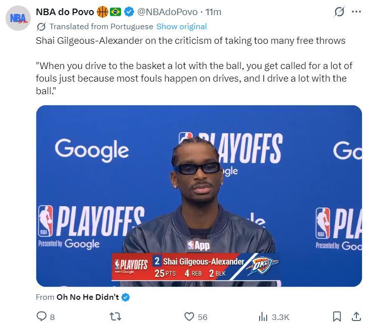 賽後亞歷山大回應自己17罰25分:當你頻繁持球衝向籃筐時,你就能製造很多的犯規就能站在罰球線,因爲大多數的犯規都是在你衝向籃下時,而我就是那個持球衝擊籃下的人。
