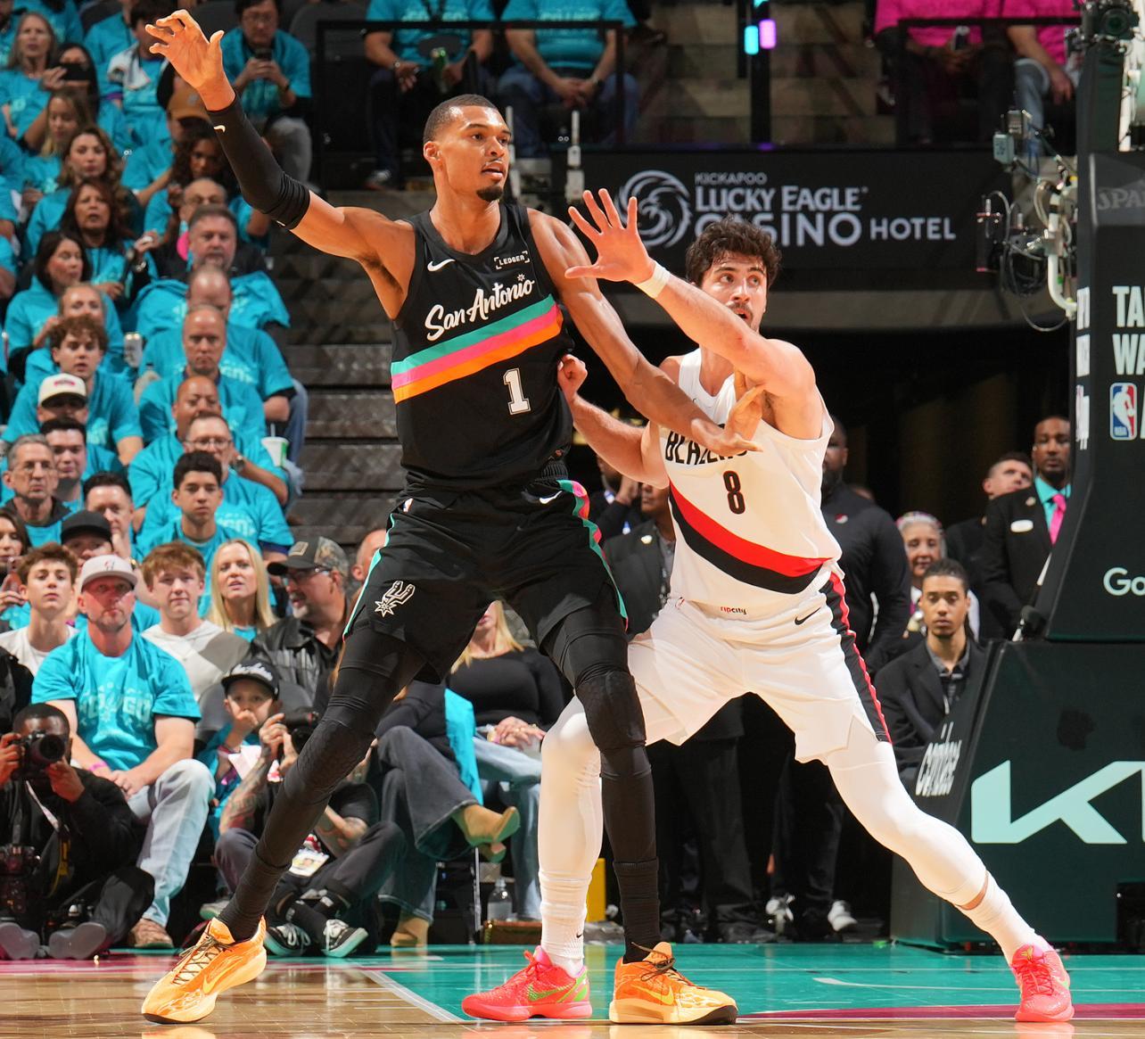 文班亞馬不管是背身、面框都有着巨大的優勢,上半場他就已經有多次暴扣,第二節8分鐘裏7中41,三分2中1拿到9分1籃板,半場僅僅17分鐘,13中8+三分4中3拿到21分2籃板1助攻1蓋帽。不過就算文班亞馬還在場下馬刺也一直領先開拓者。