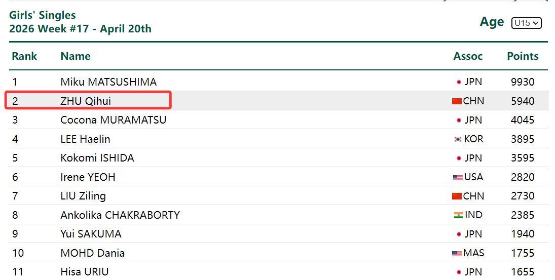 雖然祝啓慧進入2026賽季後狀態有所下滑,但她才14歲還有無限可能性,跟她對陣的球員年齡都比她大,她U15(世界第二)、U17(世界第五)、U19(世界第11)都在打。