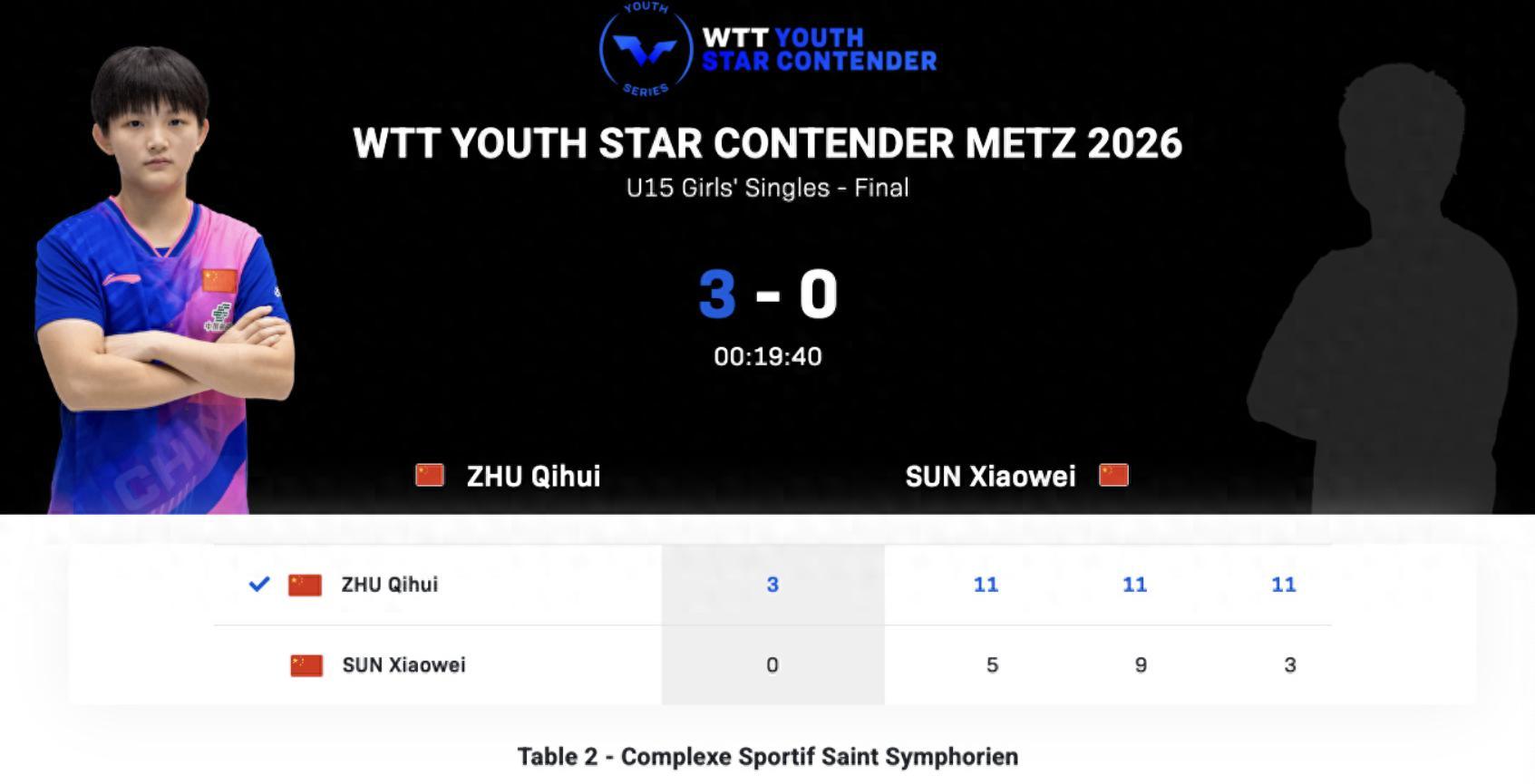 幾天之前孫笑薇剛剛在WTT青少年常規挑戰賽盧森堡站拿到U15女單的冠軍,她的世界排名也從第69升至第26,不過面對U15女單世界排名第二的祝啓慧她就無法招架了,兩人在天賦層面上還是差了一些。