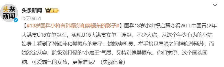 在去年北京大滿貫祝啓慧奪冠後,央視體育盛讚祝啓慧是樊振東+孫穎莎的合體,在她身上看到了孫穎莎與樊振東的樣子,她颯爽機靈,舉手投足眉眼之間神似孫穎莎;而她淡定從容、跨級別打怪的“小魔王”氣質,又特別像樊振東。