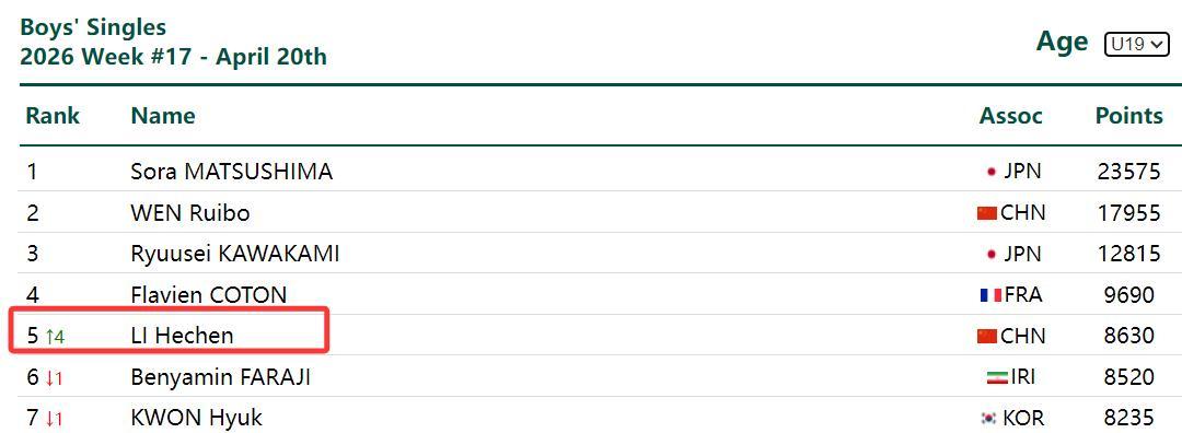 李和宸在U19男單世界排名第五,溫瑞博是U19男單世界第二,松島輝空是世界第一。