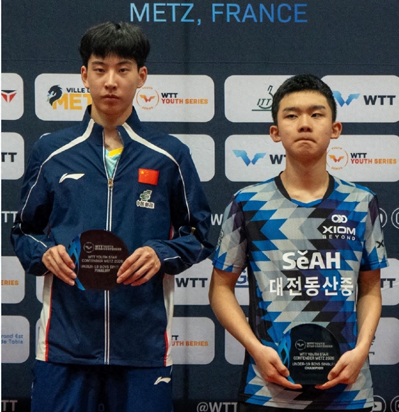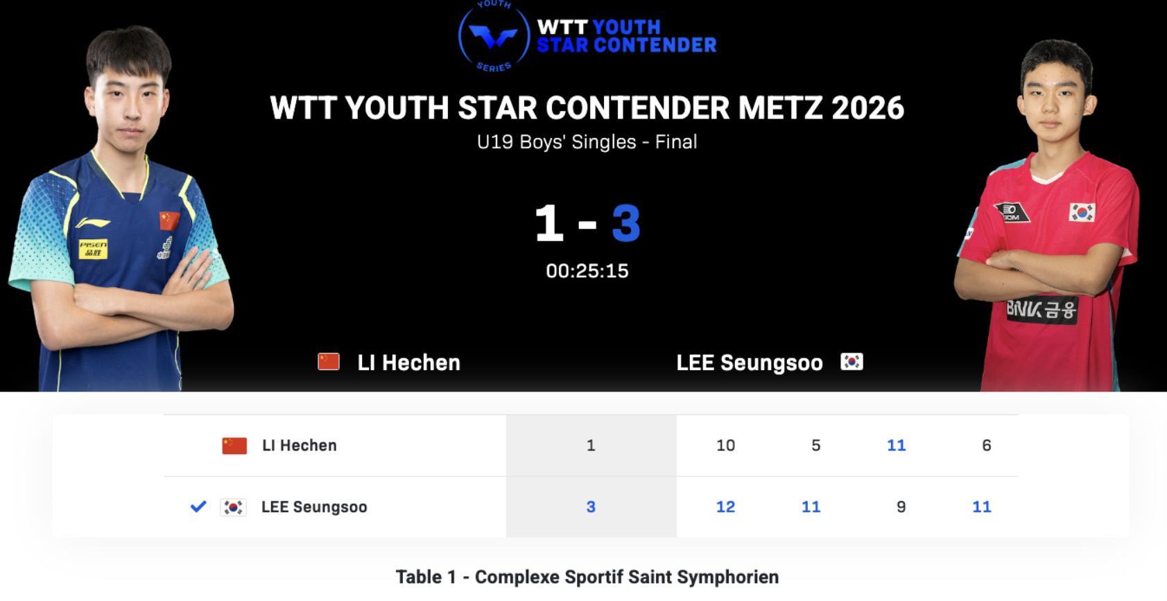 北京時間4月20日,WTT青少年球星挑戰賽梅斯站丨U19男單決賽,李承洙3-1擊敗李和宸,四局比分:12-10、11-5、9-11、6-11。沒想到韓國15歲的天才少年李和宸在U15男單決賽中不敵陳逸舟,卻在U19男單決賽中擊敗了17歲的李和宸。