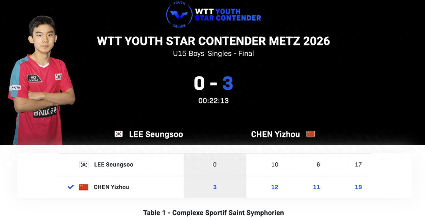 北京時間4月20日,WTT青少年球星挑戰賽梅斯站丨U15男單決賽,陳逸舟3-0擊敗李承洙奪冠,三局比分:【12-10,11-6,19-17】。這三局比賽有兩局都打到爆分,尤其是第三局兩人多次互換局點/賽點,最終兩人合計36分才決出勝負,陳逸舟有一顆大心臟。