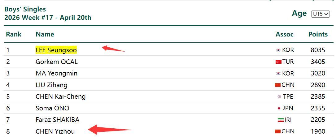李承洙更是U15男單世界排名第一的選手,而陳逸舟通過前兩站的努力他的U15男單世界排名才升至第八,但兩人之間的積分差距無比之大,李承洙積分高達8035分,而陳逸舟積分只有1960分,兩人積分差距6075分,陳逸舟在這個賽季很難超過李承洙,但陳逸舟在本站是橫掃李承洙,這就是天賦使然。