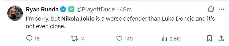 美記Ryan Ruede:很抱歉,約基奇的防守能力遠遜於東契奇,兩人防守能力不在一個層次。