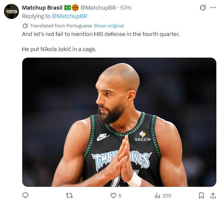 美媒:我們不要忘記戈貝爾末節的防守表現,他直接將約基奇關進籠子裏。